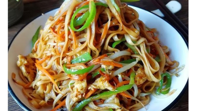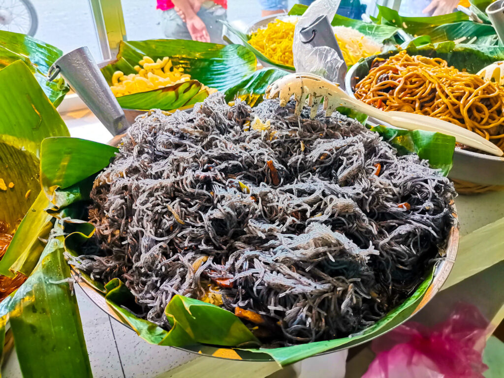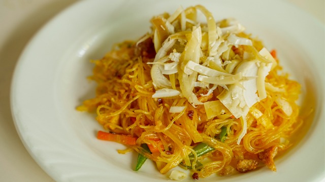 将香蕉花先用醋炖过,去掉涩味后带出迷人的酸香,再与金黄色的蛋面和柔软的米粉一同翻炒。酸、香、咸交织,层次分明;面条的弹、香蕉花的韧,口感丰富而特别。