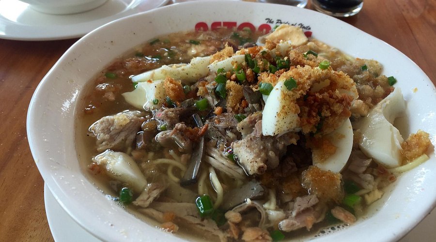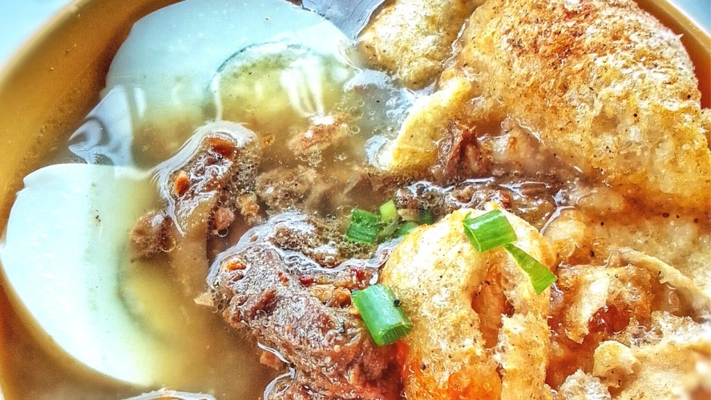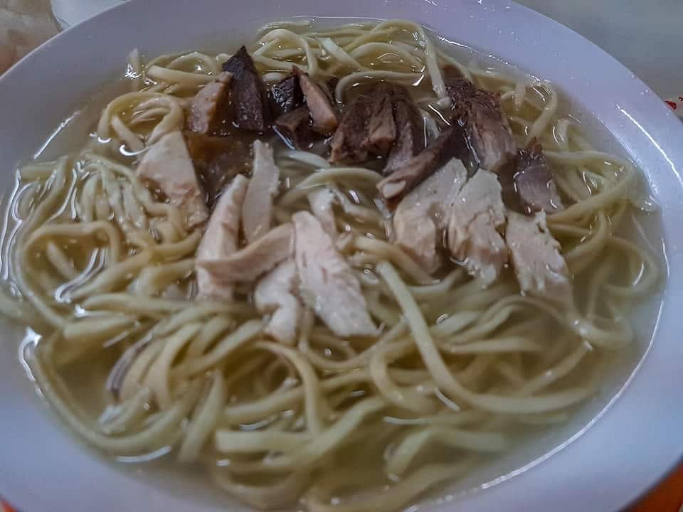 一碗让人上瘾的汤面。滚烫的骨汤淋下,瞬间唤醒碗底的蛋面与香气。浓白的汤头是用牛骨、猪骨与内脏慢火熬出的精华,入口鲜香厚重,却又带着一丝甘甜。最道地的吃法,是配上一小块微甜的米糕puto,再挖一勺骨髓——浓郁与清甜在口中交织,暖进心里。