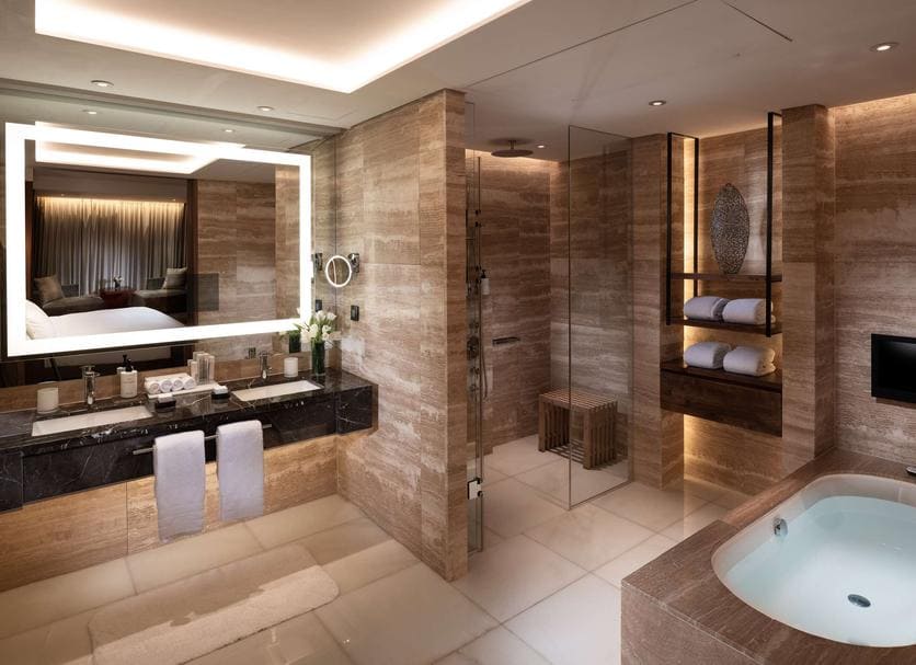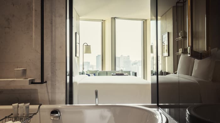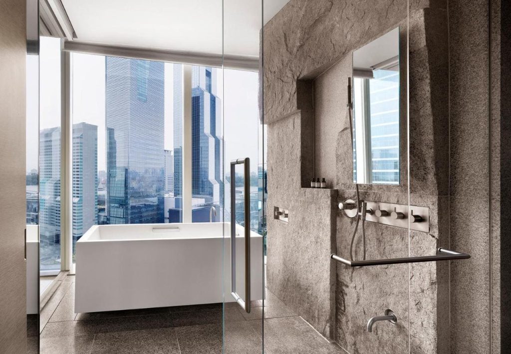 185间客房的精巧体量,无疑是让当时动辄超过500间客房的首尔酒店们见识到了何谓“小巧”的奢华。42平米起跳的基础房加之敞亮通透的落地窗和未经分割的空间动线,都尽显柏悦在空间的阔绰手笔。浴室部分采用粗粝花岗岩的设计,更是先锋到让人拍案叫绝。