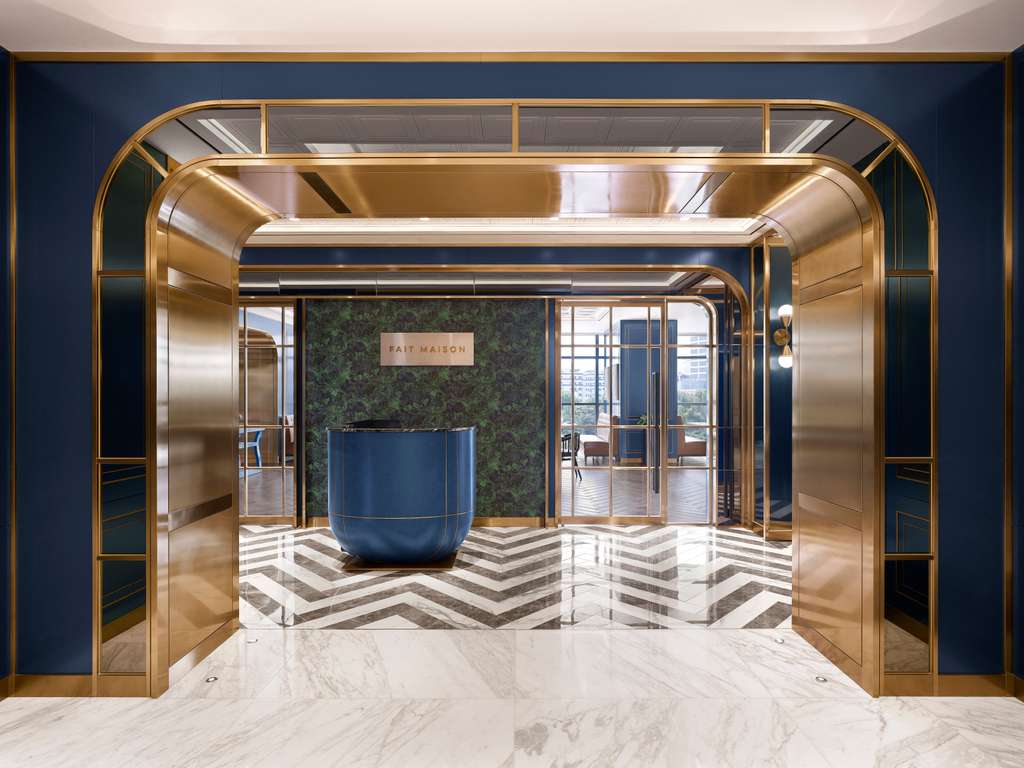 迎宾区采用精致的亭子形结构,灵感来自韩屋(韩国传统房屋),半透明面板营造出特权空间的精致感觉,旨在提供永恒而又让人想起传统的沉浸式款待体验。环绕它的实心木梁是对韩国早期建筑风格的进一步致敬。