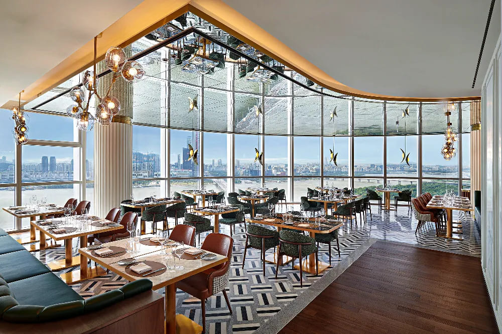 与地铁汝矣岛站相连的「首尔康莱德酒店」,是希尔顿酒店集团旗下的奢华酒店品牌,以格调高雅的内部装潢、洗练迷人的服务、丰富的设施设备,以及能将首尔市中心街景一览无遗的奢华景观闻名。位于37楼的「37 Grill & Bar 」身兼餐厅与酒吧,这里能让人180度眺望汉江,比客房更完善的全景风光非常受欢迎。餐厅中最吸引人的就是高级韩牛与现流海鲜等各式美食。此外,拥有开放式厨房可欣赏大厨手工艺的「ZEST」,自助式早餐的丰富程度在首尔也是属一属二。