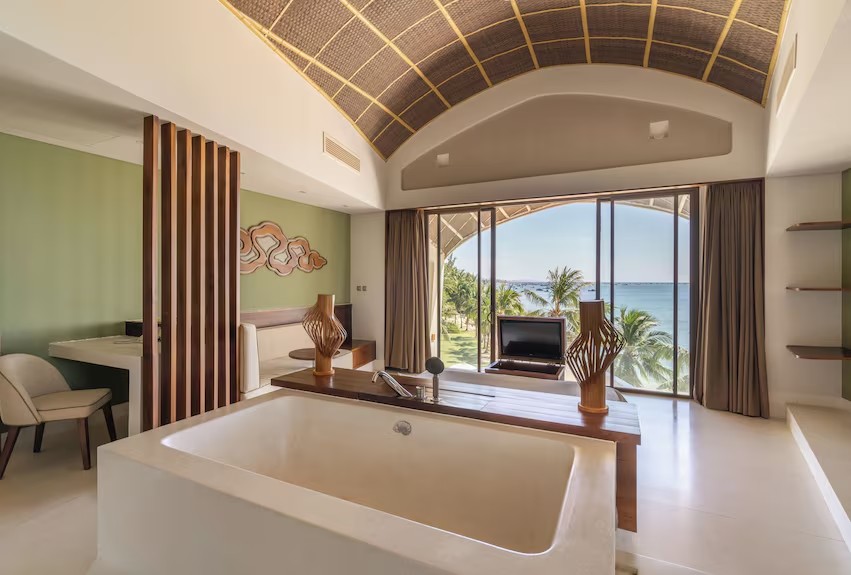 酒店有免费接送机,提前两天发邮件跟酒店确认好航班,到了富国岛机场就有工作人员举牌等,不用自己扛着行李找车;离开的时候也是酒店班车送,机场离酒店有16公里,车程半小时左右。房间很大,80平方的面积,装修是简约的风格,没有花里胡哨的设计,但窗户特别多,早上一睁眼就能看到外面的绿植,特别治愈。房间里还有个浴缸,晚上泡个澡放松一下特别舒服。