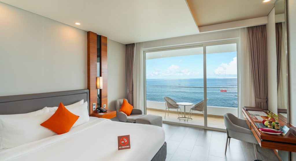 推荐海景房,推开阳台门的瞬间直接被一望无际的大海惊艳。房间还带熨衣板,小冰箱,电热水壶等设备,浴室是干湿分离的。隔音也非常好,关上窗听不到外面等海浪声。