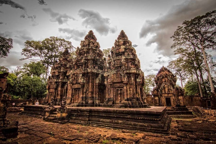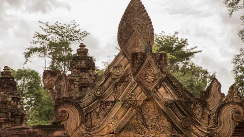 女王宫位于吴哥窟东北约 25 公里处,建于公元 967 年的罗贞陀罗跋摩二世时期,是柬埔寨三大圣庙之一。这座寺庙以精美的雕刻和独特的建筑风格闻名,与吴哥窟等大型寺庙的雄伟壮观不同,女王宫规模较小,但建筑装饰极为精美,每一处墙壁、门楣、窗棂上都雕刻着细腻而繁复的图案,有仙女、神兽、花卉等,其雕刻工艺精湛,线条流畅,被誉为 “吴哥艺术之钻”。寺庙主要由红砂岩建造,在阳光的照耀下,建筑呈现出迷人的色彩。