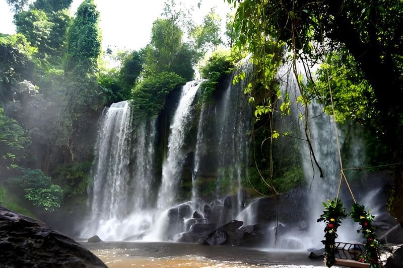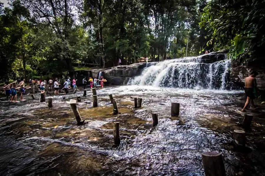 荔枝山位于暹粒省北部,距离暹粒市约 50 公里。这里不仅有壮观的瀑布,还有古老的高棉石刻遗迹。山上的圣牛瀑布气势磅礴,在雨季时水流更为湍急,瀑布从高处倾泻而下,溅起层层水花,周围环绕着郁郁葱葱的森林,景色十分迷人。在瀑布附近的河床上,分布着众多高棉时期的石刻,这些石刻有的是佛像,有的是神秘的符号,据说是古代高棉人祭祀和祈福的场所。