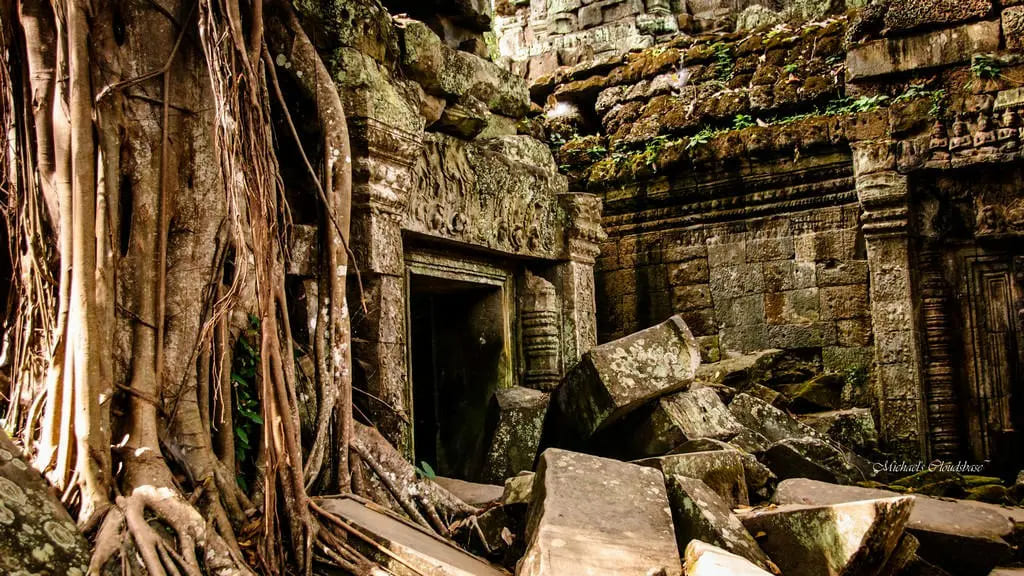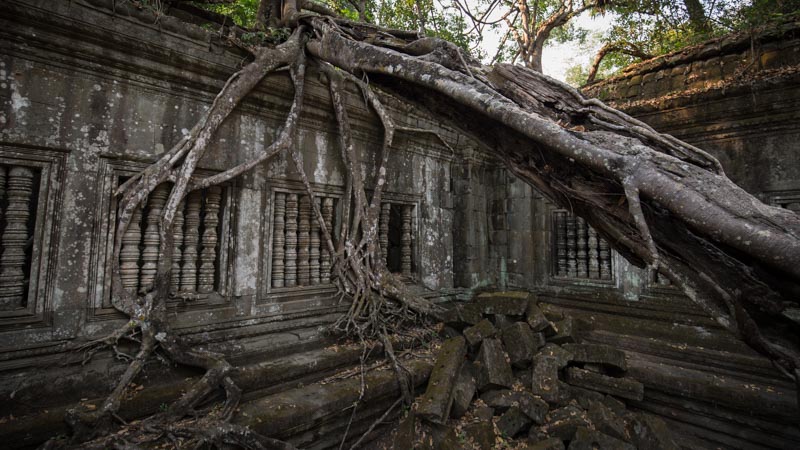 塔布隆寺位于吴哥窟东部,建于 1186 年,是阇耶跋摩七世为纪念母亲而修建。这座寺庙的独特之处在于,它被丛林紧密缠绕,树根如同巨蟒般盘绕在建筑的各个角落,与古老的石头建筑相互交织,形成了一种震撼人心的自然与人文融合的景观。寺庙内有许多巨大的树木,它们的根系深入到建筑的缝隙中,有的甚至将石块顶起、撑开,仿佛在诉说着岁月的故事。