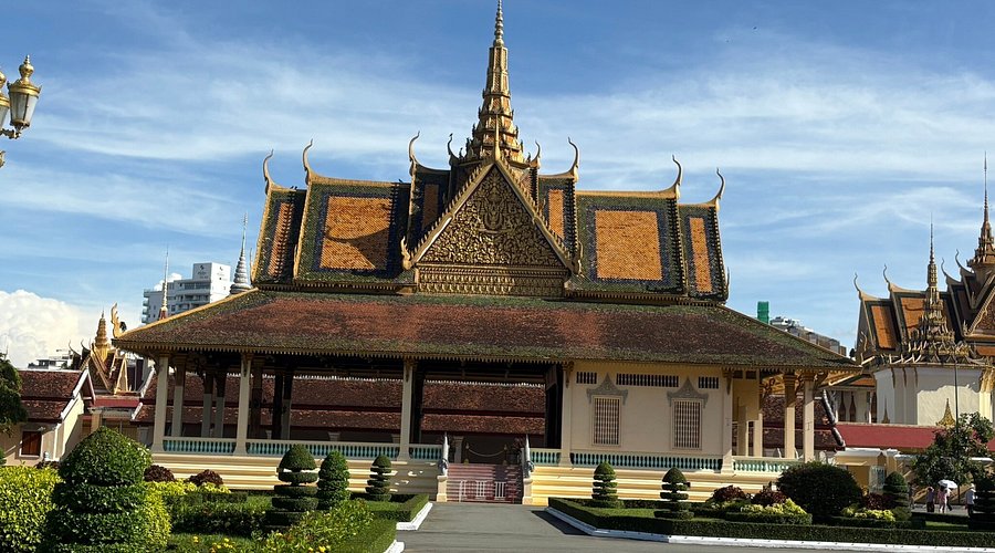 金边王宫坐落在金边的市中心,是柬埔寨国王的皇宫,也是柬埔寨最具代表性的建筑之一。王宫于 1866 - 1870 年建造,由多个宫殿组成,建筑风格融合了高棉传统建筑特色与法国建筑元素,外观华丽,装饰精美。主要宫殿包括金银阁寺、加冕厅、银殿等。金银阁寺内供奉着一尊由纯金打造的佛像,佛像上镶嵌了无数钻石和宝石,极为珍贵;银殿的地面由 5000 多块银砖铺成,因此得名,殿内还珍藏着许多文物和艺术品。