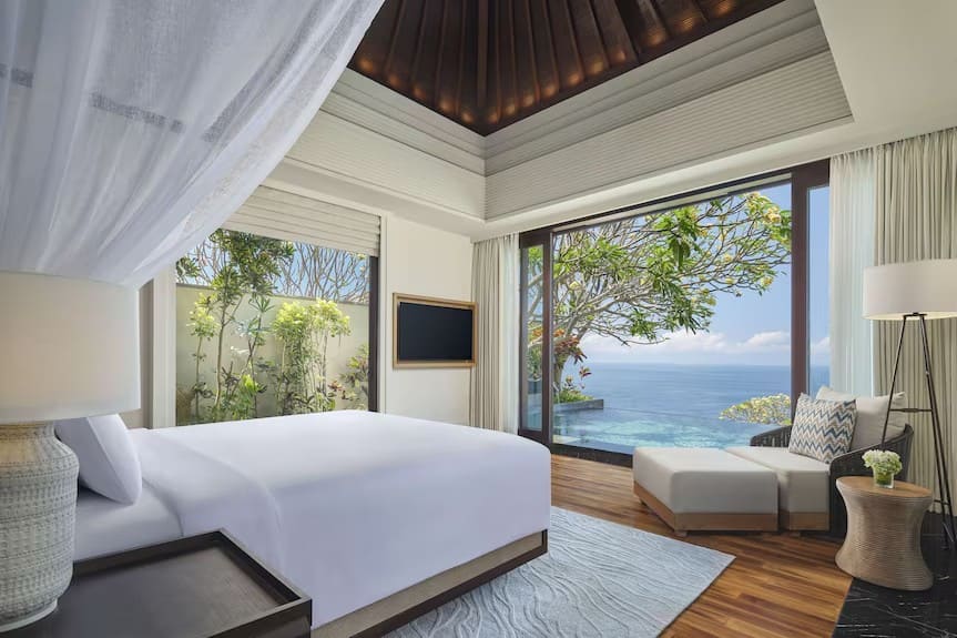 酒店位于乌鲁瓦图区域的悬崖上,这一独特的地理位置也成就了酒店绝杀级的悬崖海景。酒店整体建筑由新加坡著名建筑公司WOHA操刀,设有84栋全别墅客房,最基础的一卧室泳池别墅,面积也在290㎡起跳。而最大的三卧室别墅,面积则是达到了近3000㎡,完全颠覆想象。