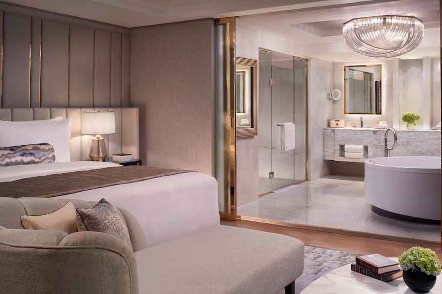 282间客房出自知名设计团队GA之手,客房面积也相当阔绰,70㎡起跳。还令人惊喜的是每一间客房都设有独览城市风光的私人阳台。