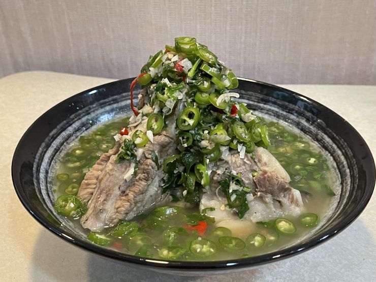 新鲜的猪肋排用特制的汤底煮后捞出,然后把超长超大的排骨堆砌成小山。