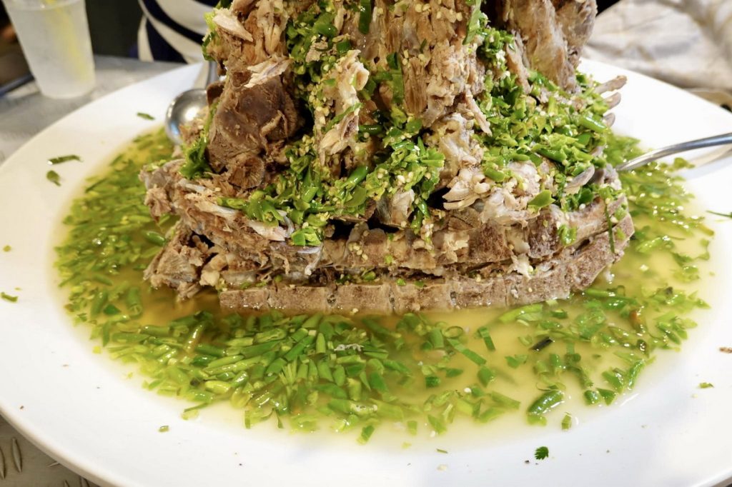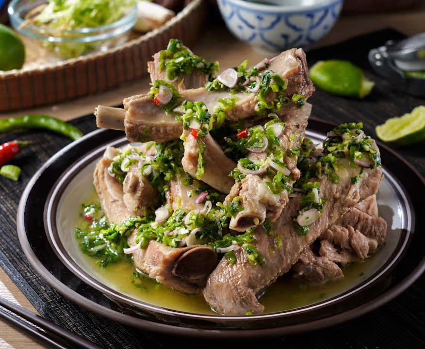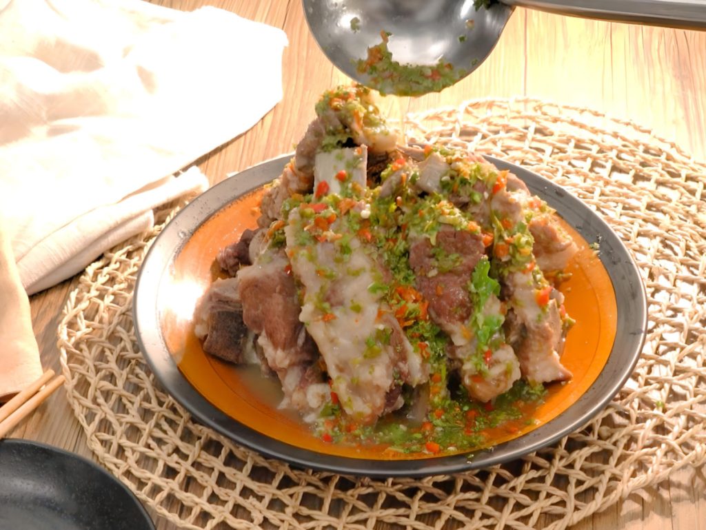 最后淋上用泰国辣椒、香菜、柠檬汁等香料熬制的料汁,吃的时候肉质鲜嫩,酸辣度更是过瘾,直接上手“啃”就对了。