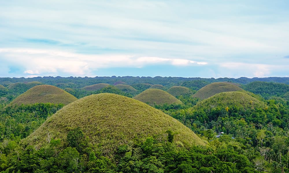 巧克力山是薄荷岛独有的景色,也是世界十大奇景之一。由1268个圆锥形小山丘组成,高度介于40到120米之间。这些山丘在雨季时呈现绿色,而在旱季时则干枯转为褐色,犹如一排排巧克力排放在大地上,因此得名“巧克力山”,附近还有世界最小的迷你眼镜猴。