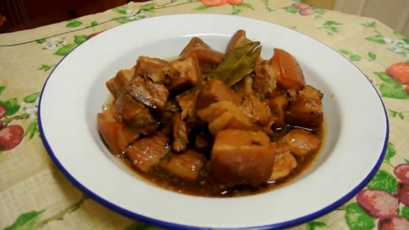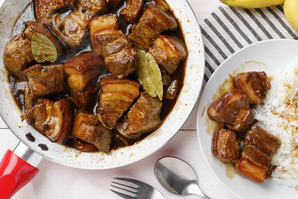 其名称源于西班牙语“adobar”(腌制),adobo是最流行的菲律宾菜之一,以独特的调味和简单的烹饪方式著称。Adobo通常以鸡肉或猪肉为主材,通过酱油、醋、蒜、月桂叶等调料长时间慢炖,打造出酸甜咸香交织的丰富口感。无论是作为家庭餐桌上的主菜,还是作为米饭的最佳搭档,Adobo都能轻松俘获你的味蕾。
