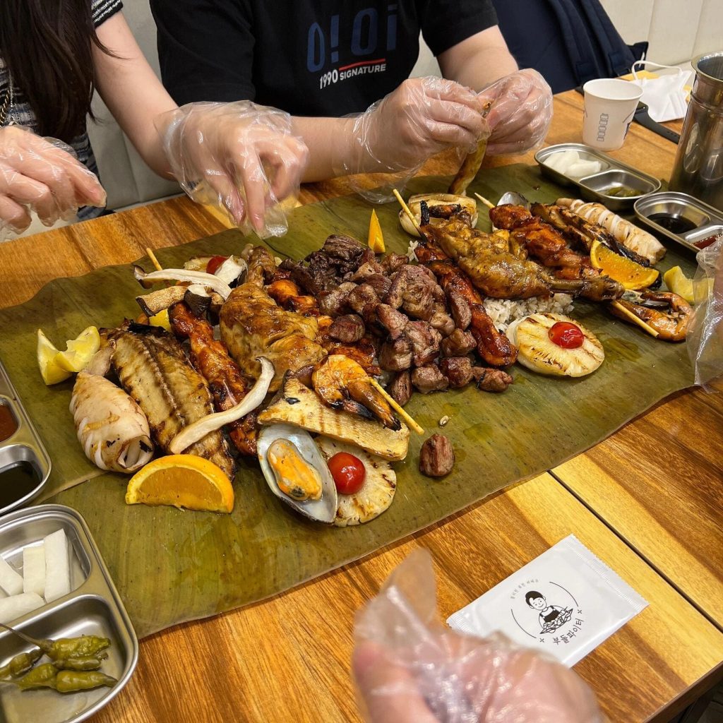 Kamayan是菲律宾非常经典的一道菜肴,顾名思义就是用手抓饭吃。餐厅会提供一次性手套,让你用最原始的方式享受高级感。食物的摆放顺序也有讲究,绿色的香蕉叶盛着香喷喷的米饭,上面铺满了海鲜,包括青口、虾、烤鱼(Milkfish无骨或Tilapia有骨)、鱿鱼、烤肉串、烤五花肉、秋葵和烤茄子,最后还有芒果沙拉放在旁边。吃起米饭包裹着各类食材油脂的海鲜,鲜咸香的味道立刻充满口腔。