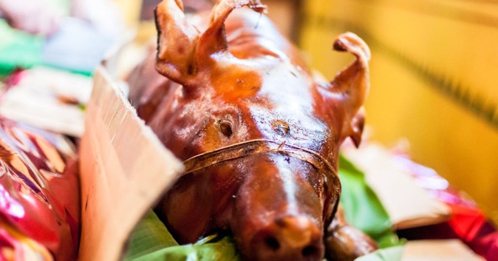 菲律宾烤乳猪(Lechon)是菲律宾传统美食,技艺由西班牙殖民者引入菲律宾,后与当地饮食文化融合,发展为特色美食。其名称“Lechon”源自西班牙语“Leche”(奶),指代仍在哺乳的乳猪。该菜肴在菲律宾被视为“国菜”,尤其在节日庆典中不可或缺。
