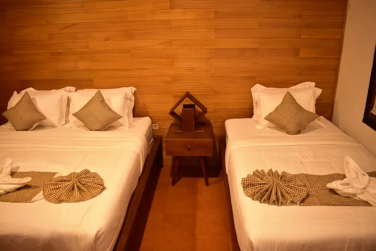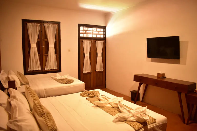 酒店共有 82 间客房,包括豪华双人间、豪华三人间、高级间、套房等多种房型。房间内融合了当地文化与自然元素,旨在提供舒适、温馨且具有地方特色的体验。酒店的房间以简单、自然为主,采用传统的爪哇风格装饰,使用本地木材和天然材料,营造出温暖且亲近自然的氛围。